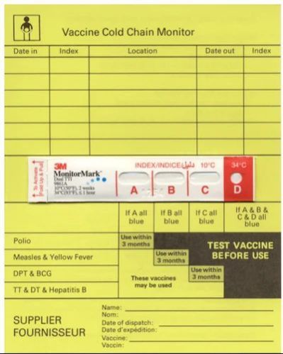 Placed inside secondary shipper boxes of temperature-sensitive products during shipment and storage, the indicators provide information to assist in estimating time and temperature exposure.