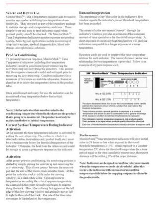 MonitorMarkTM Time Temperature Indicators not only signal when a threshold temperature has been exceeded, but provide an easy-to-read visual signal to estimate the minimum amount of time a product has spent above the threshold temperature.