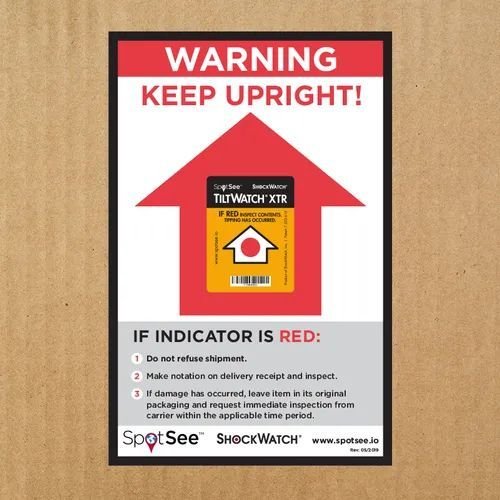 SpotSee tilt indicators detect unacceptable tilting on goods that must remain upright. When attached to a package, the TiltWatch XTR turns red if the package is tilted past 80°.